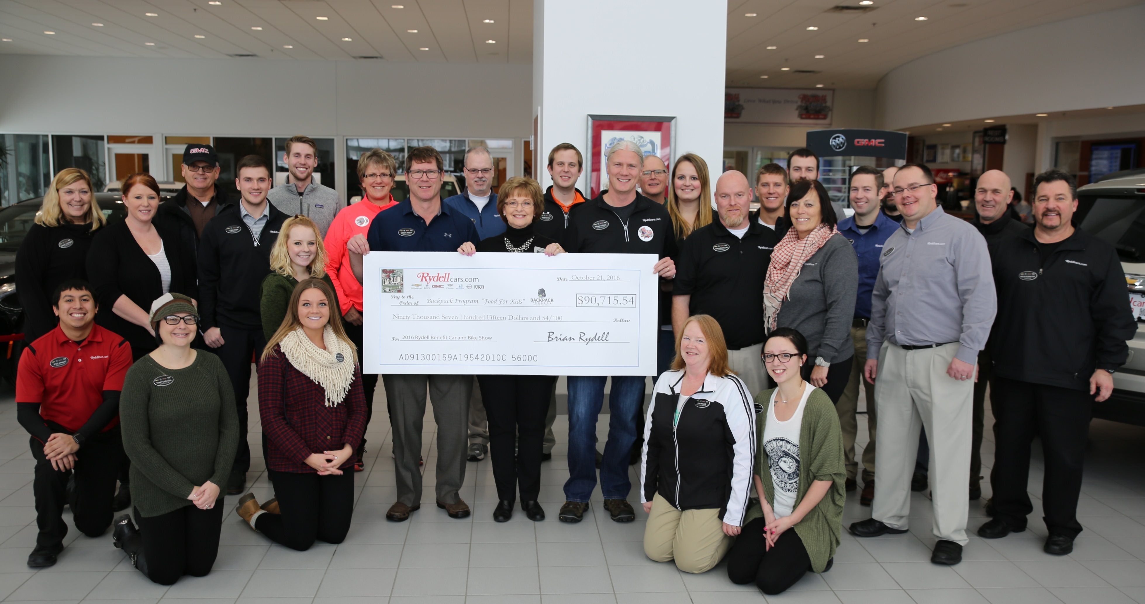 With the proceeds from the 11th Annual Benefit Car & Bike Show and the Rydell corporate match of funds raised, $90,715.54 was donated to the Backpack program of Grand Forks, ND.